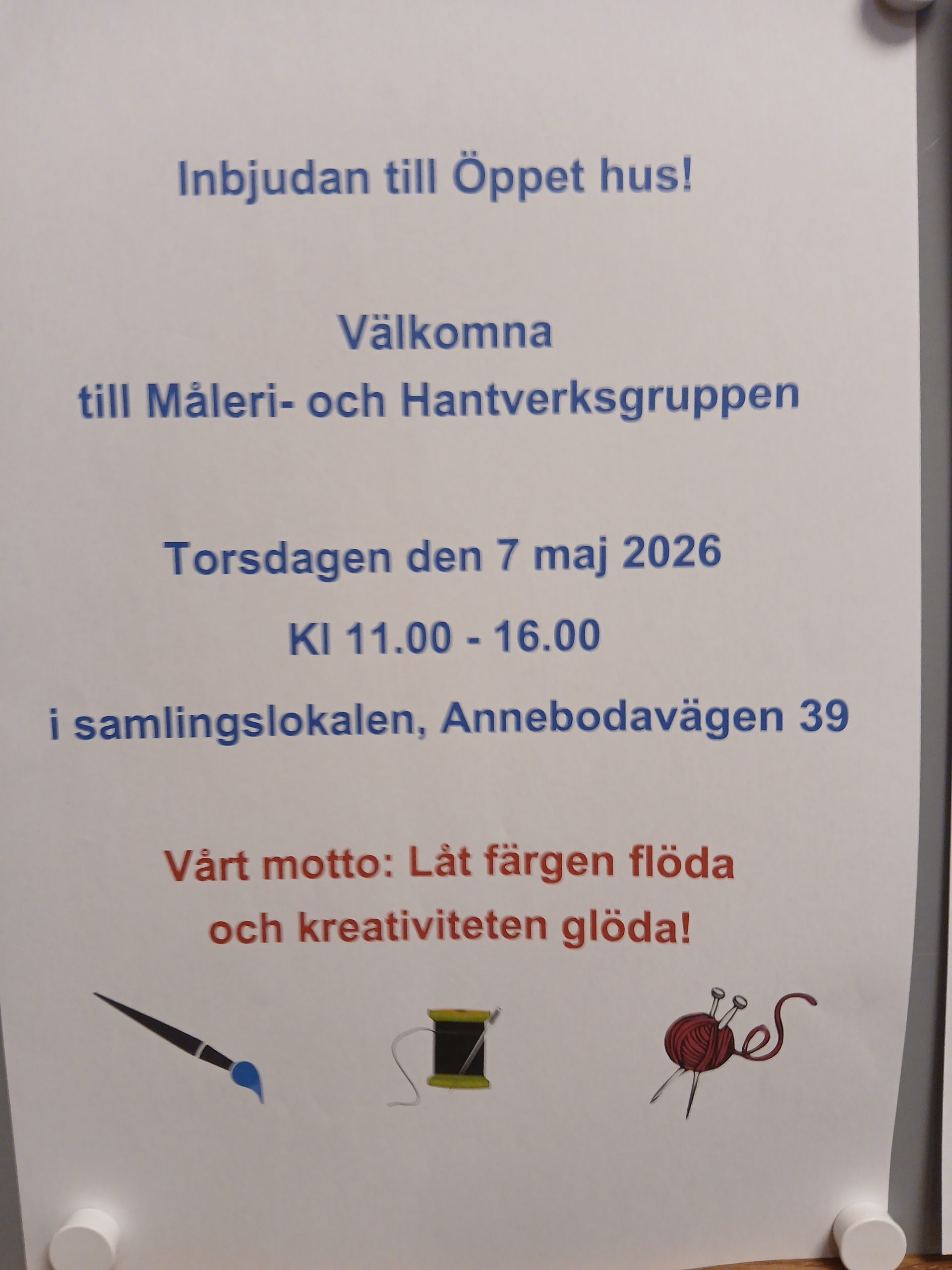 Måleri och hantverksgruppenbjuder in till öppet hus torsdagen den 7 maj 2026 11.00 – 16.00 i samlingssalen 39:an.